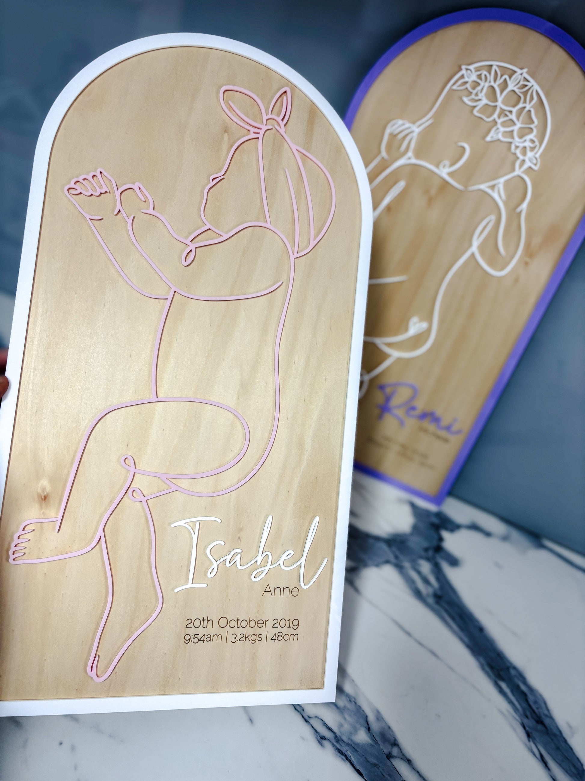 Made from high-quality laser ply and acrylic, each piece is personalised with your baby’s name, birth details, and finished in your chosen colours. A truly special keepsake to treasure forever.