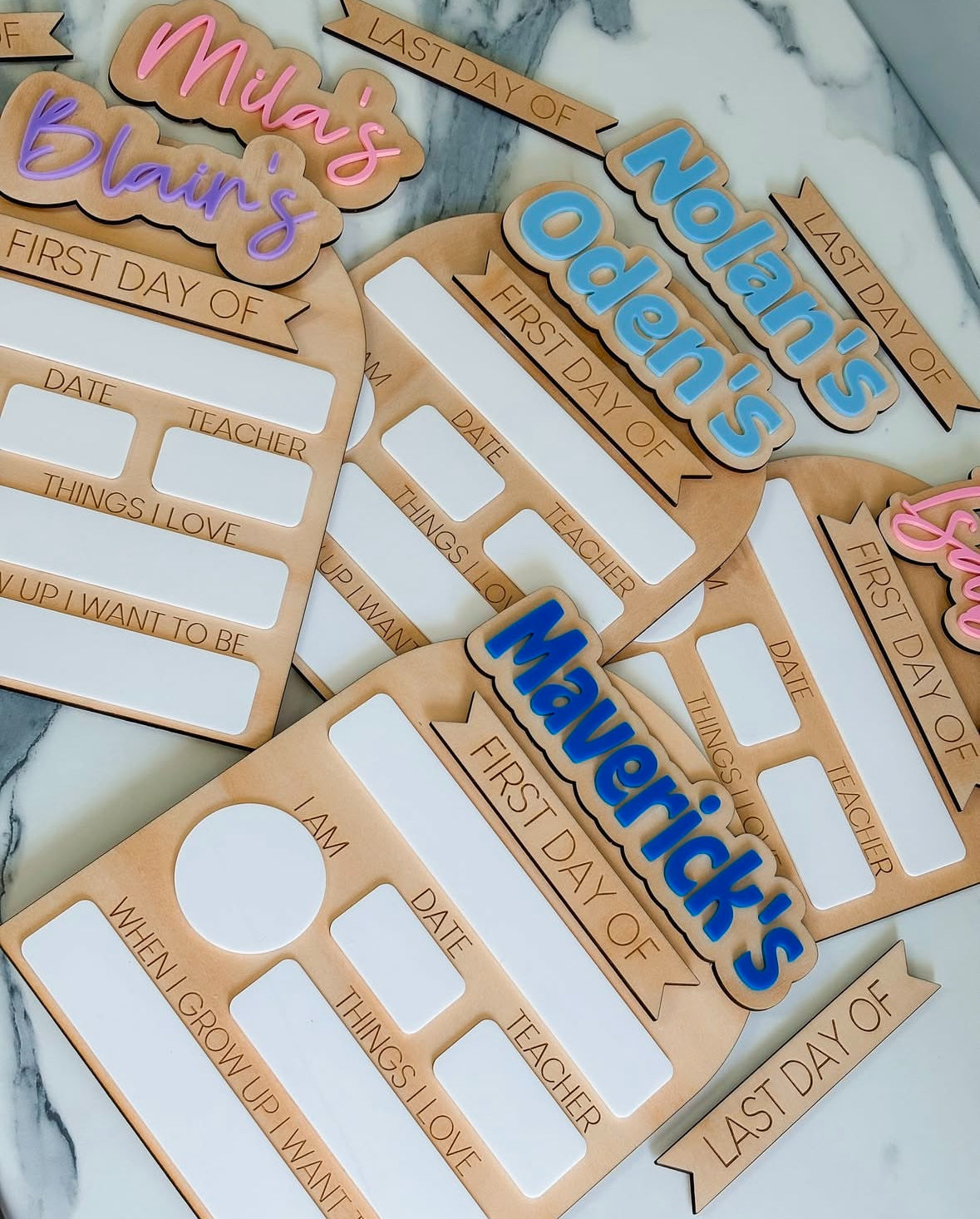 Designed as interchangeable plaques, you can capture both the first day and last day of school in one keepsake. Each board features: