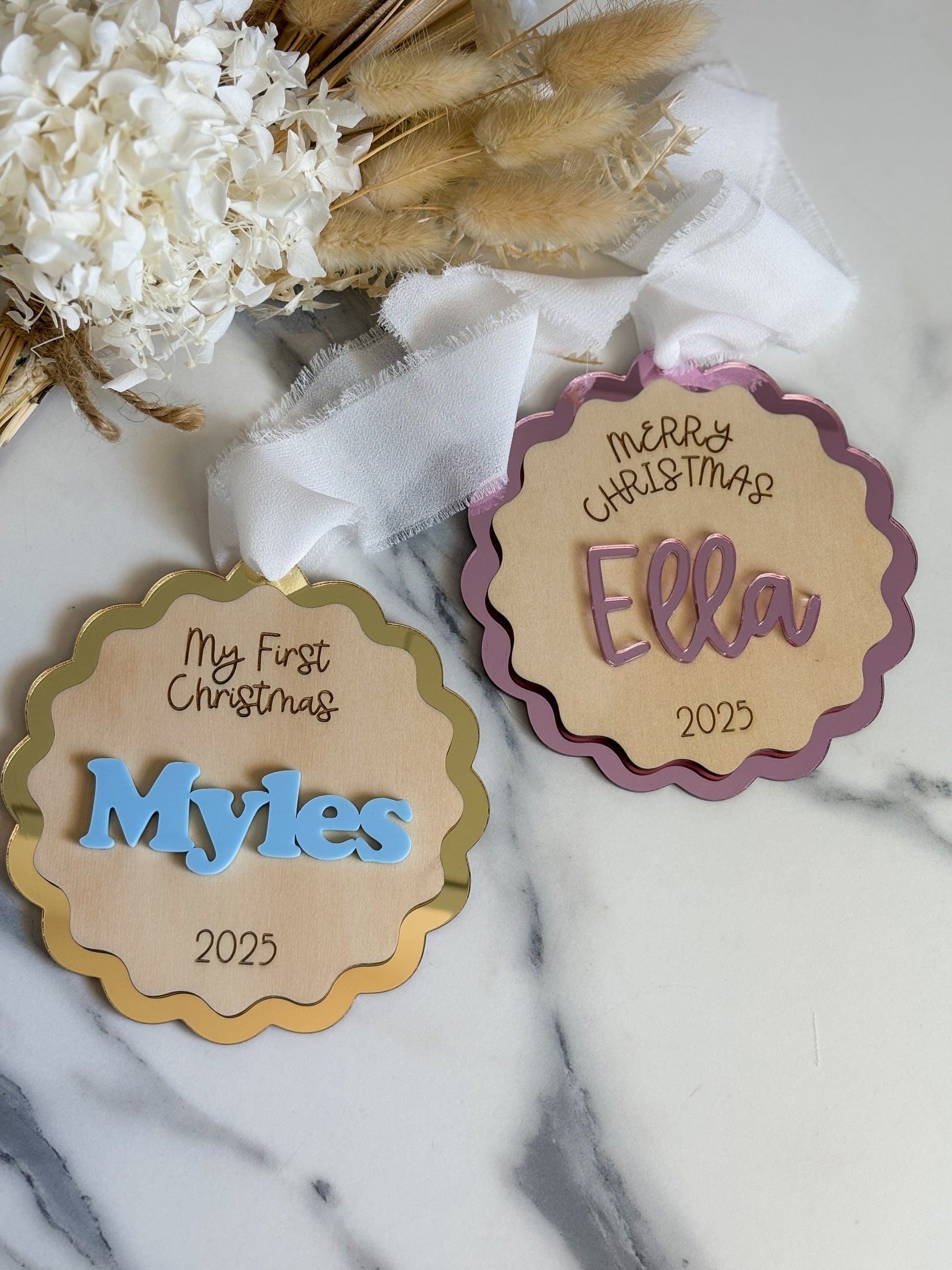Beautiful layered ornament featuring your choice of “Merry Christmas” or “My First Christmas” design. Personalised with your chosen name, year, and mirror acrylic border for a stunning festive touch. A perfect keepsake or gift for the holiday season.