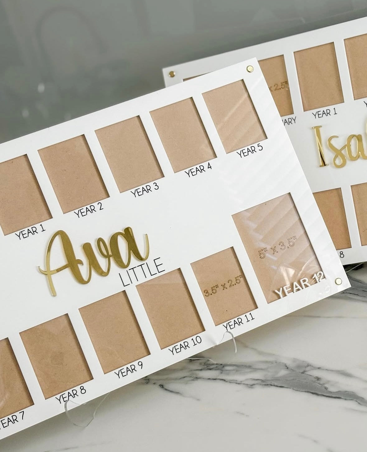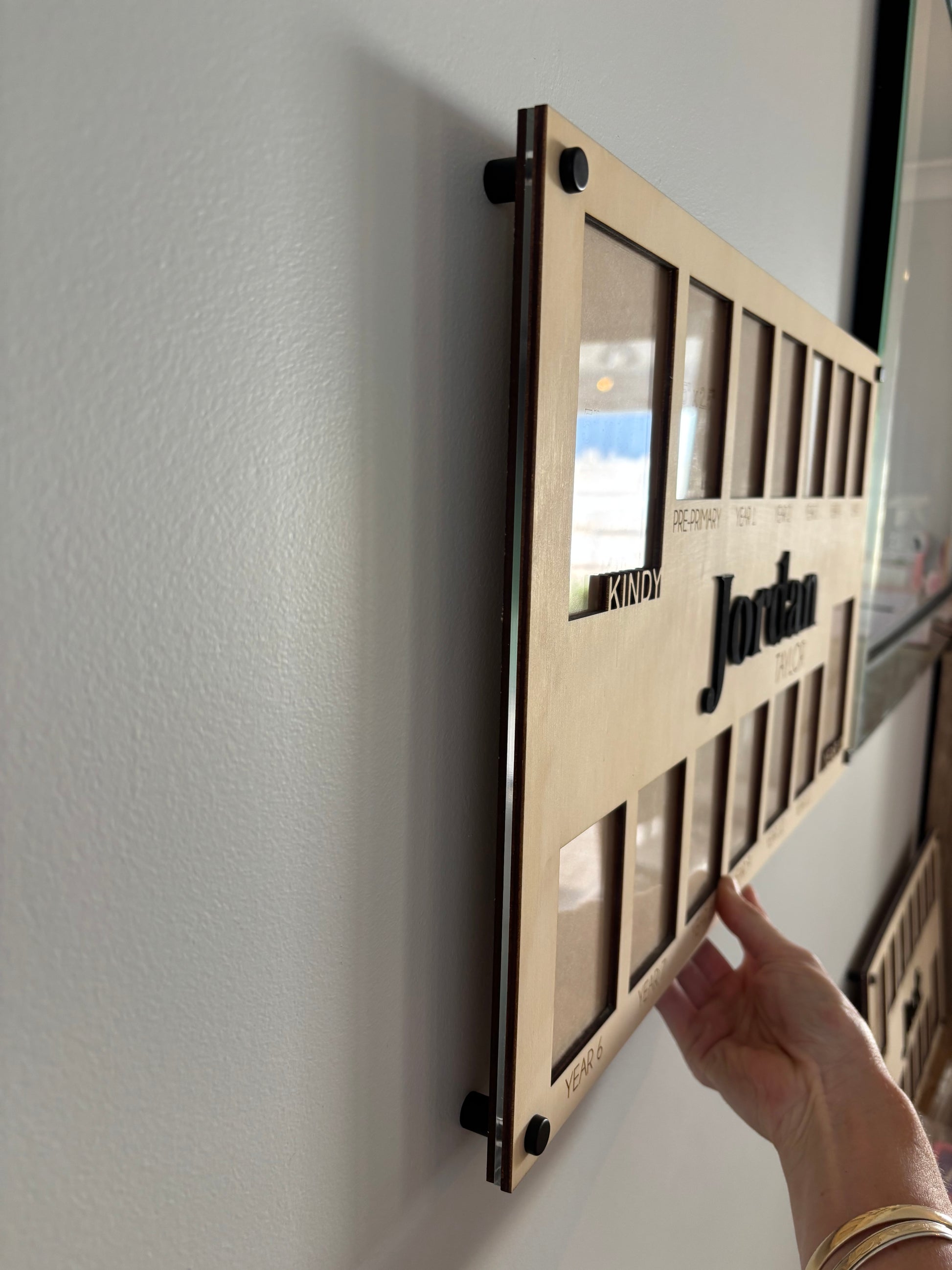 Celebrate your child’s journey from Kindergarten to Year 12 with a beautifully crafted, custom-made school year photo frame. This timeless keepsake allows you to display their school photos year by year, creating a cherished visual record of their growth.